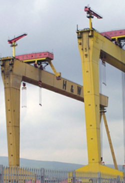 "Dominating the Belfast skyline as twin monuments to industrial power, the Samson and Goliath gantry cranes remain the most iconic symbols of Harland & Wolff's immense lifting capacity. Engineered to a modified Krupp Ardelt design, these yellow giants redefined the shipyard's efficiency. The first, Goliath, was completed in July 1969, standing as a proud achievement of the yard's own fabrication teams who constructed the majority of the crane on-site. Her sister, Samson, arrived in its entirety from Germany in 1974 to complete the pair. With a combined lifting capacity of over 1,600 tonnes, they transformed Queen's Island into one of the most advanced maritime facilities in the world - a status they still hold in the hearts of the people of Northern Ireland."