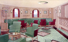 SMOKEROOM Essentially masculine in character, the main smoke room is paneled in chestnut and is provided with comfortable easy chairs some upholstered in coral coloured hide and others in blue. And if before retiring a cosy chat and comforting "nightcap" is called for the roomy lounge on "A" deck or the smoke room on the promenade deck will agreeably round off the day. Nor indeed should the opportunity be missed of visiting the cocktail bar on the sun deck cunningly recessed deep into the funnel.